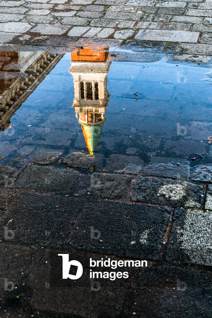 BBF11992091 Venice (Italy). St. George Major, San Giorgio Maggiore (begun 1566; arch.: Andrea Palladio; completed by Vicenzo Scamozzi 1610). The campanile of San Giorgio Maggiore reflected in a puddle.