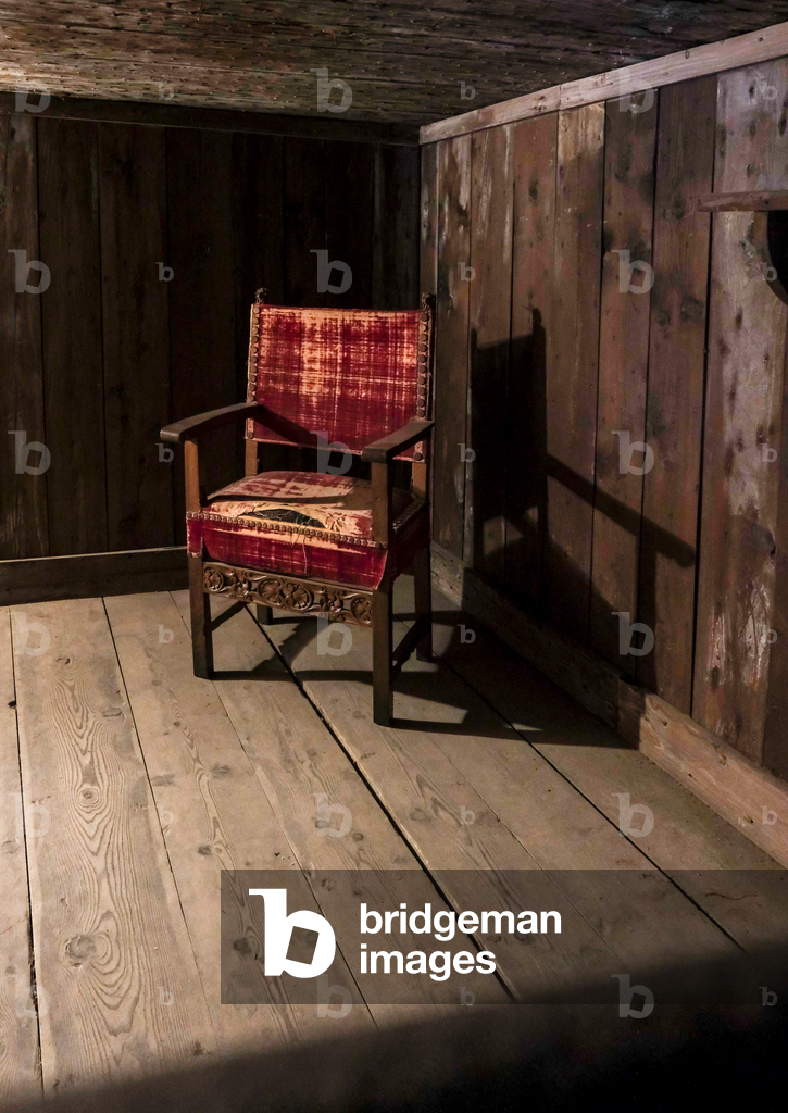 BBF11992029 Venice (Italy), Doge's Palace / Palazzo Ducale (built from 1340), lead prison under the roof of the Palace where Casanova was imprisoned and from which he escaped; Casanova's cell with his armchair.
