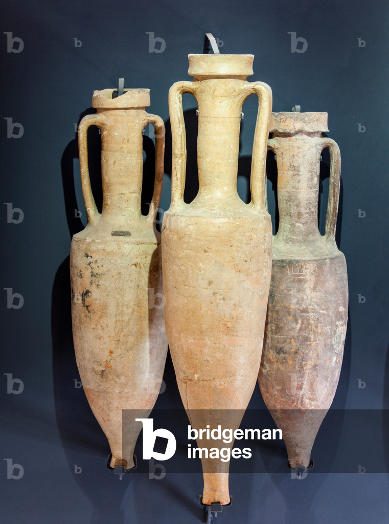 BBG11983589 From left to right: wine amphora from Tarraconnaise, Catalonia (Pascual 1 type); amphora from Betique, southern Spain (Dressel 12 type) for transporting preserved fish (garum and brine); wine amphora from Gaule Narbonnaise (Gauloise 1 type).Toulouse (Haute-Garonne), Saint-Raymond Museum.