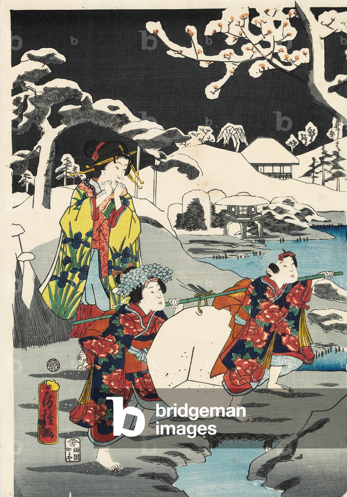 CH11985477 By Yoshiiku and Fusatane UtagawaFrom Winter (Fuyu), from the series Four Seasons of Genji (Genji shiki no uchi), signed Fusatane ga (on right and left sheets), Oju Fusatane ga (on center sheet), published by Kagaya Kichiemon (Kichibei), 1861, 6th month