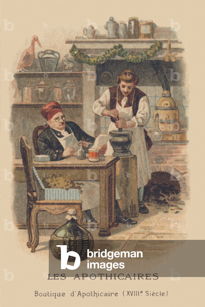 DUV11985236 Apothecaries (Pharmacists) - Apothecary store (18th century) in "Anciennes corporations et métiers. Series of 25 chromolithographs. Published by SALVY (dairy flour brand, children's food), Paris, early 20th century. Dimensions: 10.5 x 7 cm."