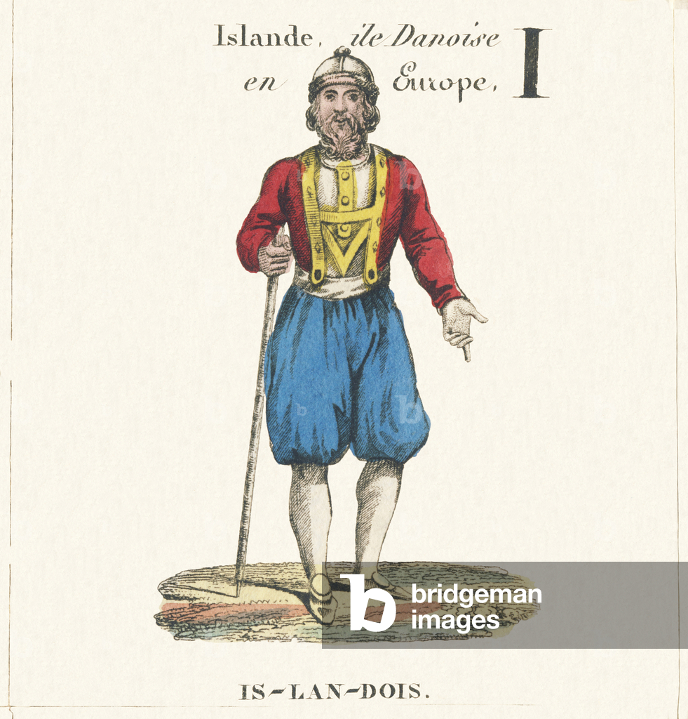 DUV11985219 Islandois - Danish island in Europe. in "Alphabet des costumes. Hocquart, Paris, rue Saint-Jacques no. 64, circa 1835. Leporello of 25 color engravings. Dimensions 11.5x10.5 cm."