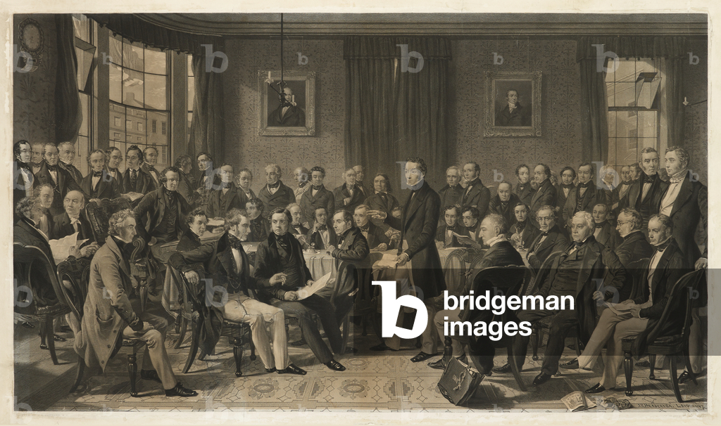 MAN11989872 English economist and politician Richard Cobden at centre, addressing a large group of members of the Council of the Anti-Corn Law League standing and seated around him. He is holding paper in his left hand and looking left. There is a copy of 'Punch' on the floor in the right foreground. Published by Thomas Agnew & Sons, Exchange St, Manchester, June 25th 1850.John Rogers Herbert (after) (1810 - 1890)