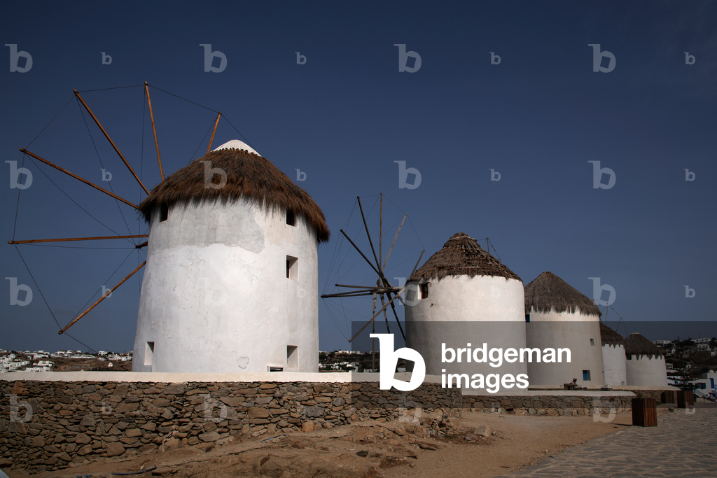 SCN11989231 Restored windmills, symbol of the island, Mykonos Town, Mykonos, Cyclades Islands, Greece Restored windmills, symbol of the island, probably built by the Venetians in the 16th century