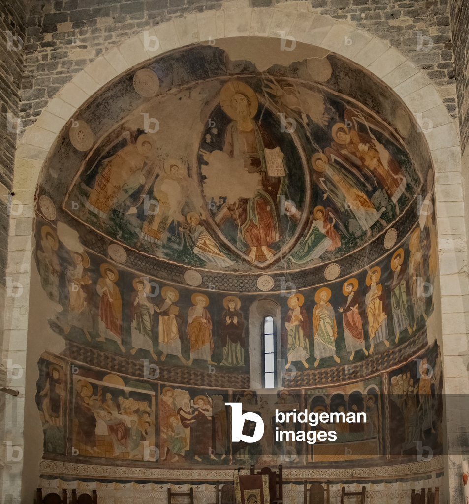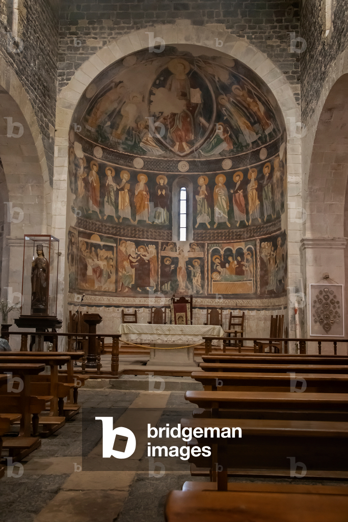 SCN11989639 Interior, The Basilica della Santissima Trinità di Saccargia (Catholic Basilica of the Holy Trinity of Saccargia, one of the most important Romanesque sites on the island. Constructed in local stone, black basalt and white limestone, in 1116 over the ruins of a pre-existing monastery. Abandoned in the 16th century, restored and reopened in the early 20th century), Northern Sardinia, Italy