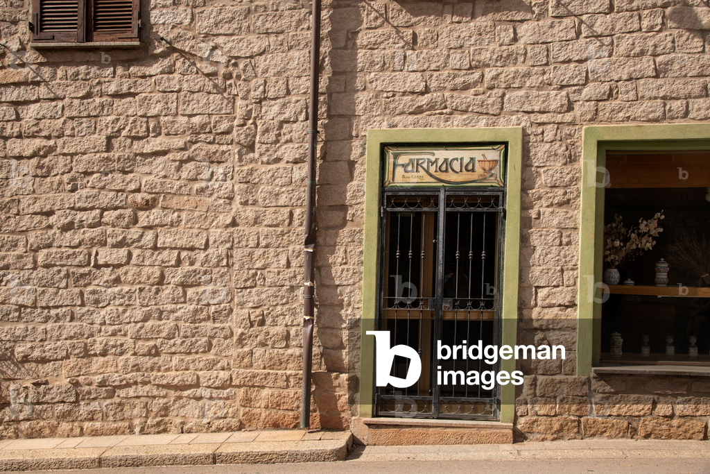 SCN11989644 Aggius street scene with pharmacy building, Sardinia, Italy