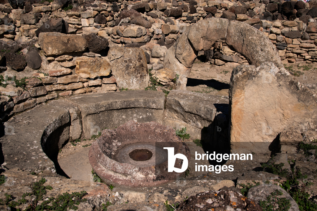 SCN11989600 Interior of round village hut, Nuraghi defensive structure (2nd millennium B.C. in the Bronze Age) consisting of circular defensive towers in the form of truncated cones built of dressed stone, with corbel-vaulted internal chambers; the finest and most complete example of this form of prehistoric architecture, Barumini, Sardinia, Italy