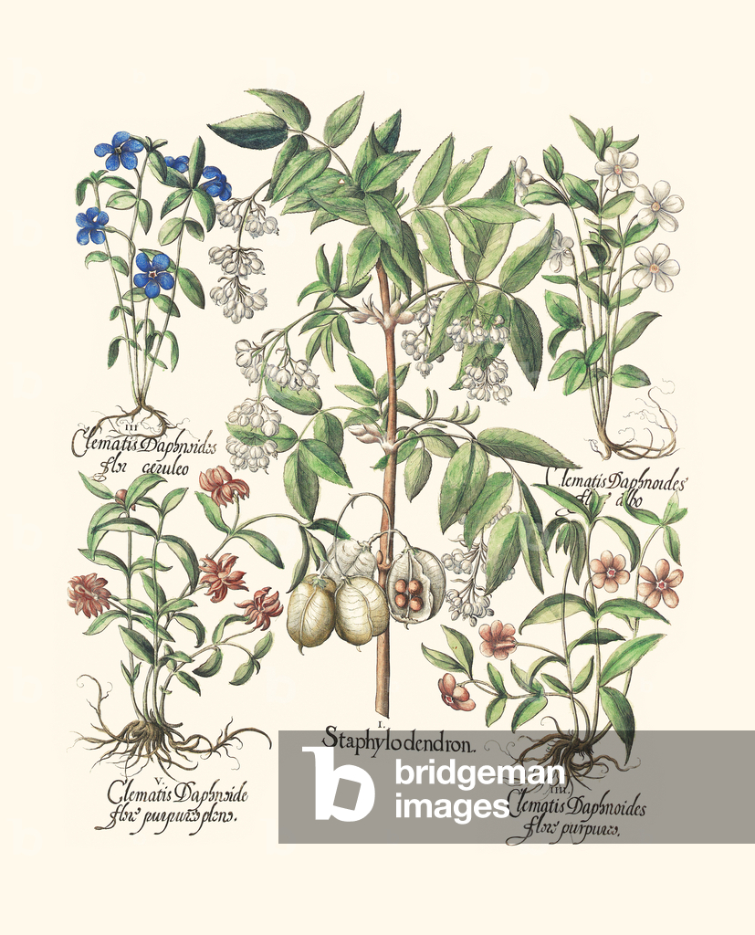 PRX11868204 The plate shows the European bladdernut (Staphylodendron) in the center with its characteristic inflated seed capsules and white flower clusters, surrounded by four different periwinkle varieties (Clematis Daphnoides) with blue, white and purple flowers. The bladdernut is a Central European shrub with pinnate leaves, while the depicted periwinkle species are low-growing, herbaceous climbing plants with simple, opposite leaves. Both plant groups were used as ornamental plants as well as for medicinal purposes. From Hortus Eystettensis or 'Der Garten von Eichstätt'. Published by Basilius Besler (1561 - 1629) in the year 1613. [The plate shows the European bladdernut (Staphylodendron) in the center with its characteristic inflated seed capsules and white flower clusters, surrounded by four different periwinkle varieties (Clematis Daphnoides) with blue, white and purple flowers. The bladdernut is a Central European shrub with pinnate leaves, while the depicted periwinkle species are low-growing, herbaceous climbing plants with simple, opposite leaves. Both plant groups were used as ornamental plants as well as for medicinal purposes.]