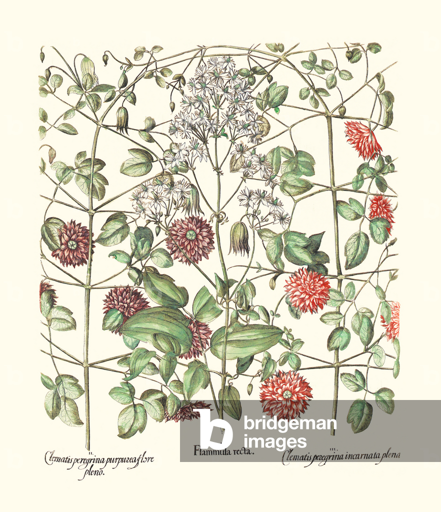 PRX11867837 The plate depicts three types of clematis with different flower forms: on the left a double purple clematis, in the center the upright clematis with star-shaped white flower clusters, and on the right a pink double-flowered clematis. These woody climbing plants of the genus Clematis are native to temperate regions of Europe and Asia and were cultivated in gardens from early times for their spectacular blooms. Their adaptability and vigor made them sought-after ornamental plants for trellises and pergolas. From Hortus Eystettensis or 'Der Garten von Eichstätt'. Published by Basilius Besler (1561 - 1629) in the year 1613. [The plate depicts three types of clematis with different flower forms: on the left a double purple clematis, in the center the upright clematis with star-shaped white flower clusters, and on the right a pink double-flowered clematis. These woody climbing plants of the genus Clematis are native to temperate regions of Europe and Asia and were cultivated in gardens from early times for their spectacular blooms. Their adaptability and vigor made them sought-after ornamental plants for trellises and pergolas.]