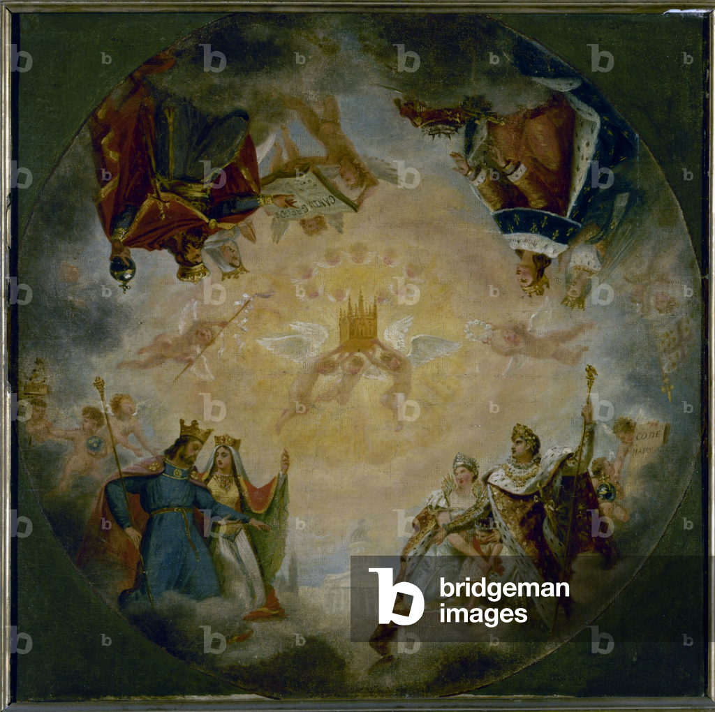 XOS8984986 Esquisse pour le Panthéon (église Sainte-Geneviève) : Gloire des dynasties royales et impériales devant sainte Geneviève (Main title); Esquisse pour le Panthéon (église Sainte-Geneviève) (Series title)Gros, AntoineA glory of angels carries the Châse de Ste Geneviève to heaven. Below Clovis and Clothilde; Napoleon, Empress Marie-Louise and the King of Rome; on the other side Charlemagne and Hildegarde; Saint Louis and Marguerite de Provence.Label - Label on reverse concerning an exhibition: "Napoléon, 1969, Musée Carnavalet / Réunion des Musées Nationaux".Inventory number: PPP4643