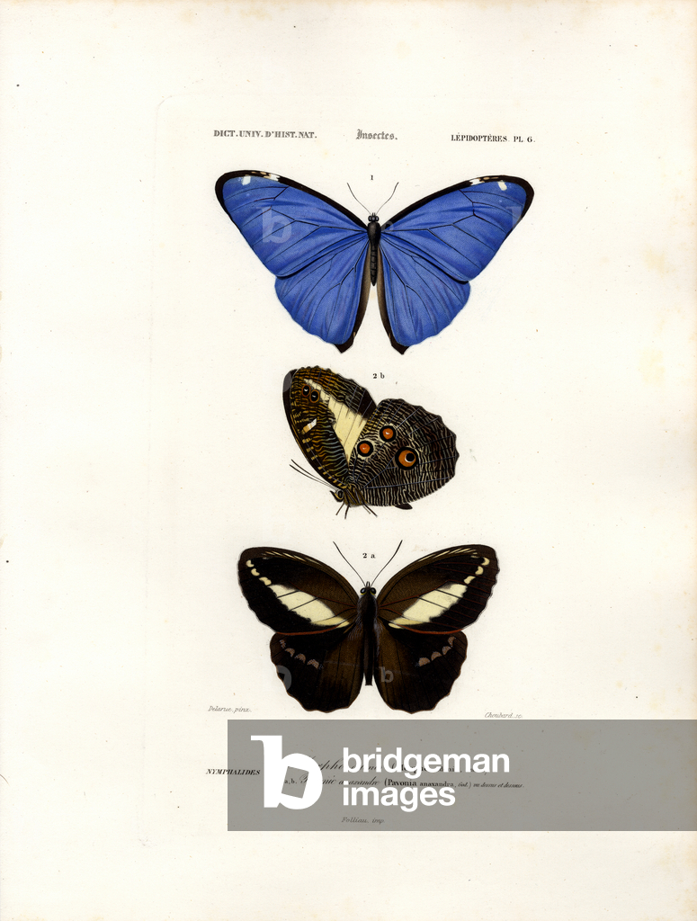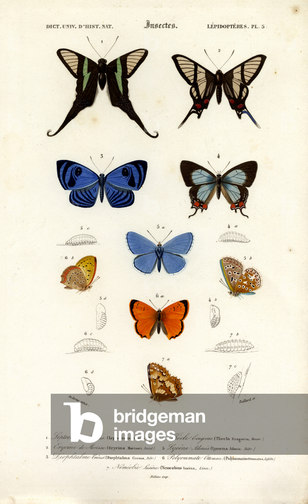 The illustration shows seven different butterfly species: two long-tailed swallowtail species (top), a blue lycaenid, two small swallowtails, and two orange-brown butterflies. Particularly noteworthy are the different developmental stages of several species - caterpillars, pupae, and butterflies are shown side by side, providing insight into the complete metamorphosis of these insects. By Blanchard pinx., Fournier sc. From Dictionnaire Universel d'Histoire Naturelle dirigé par M. Charles D'Orbigny. Paris, chez les Éditeurs MM. Renard, Martinet et Cie, 1849. [Butterflies, Lepiocircus Curius, Eryciina Morisse, Lycaena Adonis, Thecla Evanqorus, Diophthalma Cresus, Polyommatus Ottomanus, Nemeobius lucina, Metamorphosis, Insects, Lepidoptera, Entomology, Natural history, 19th century, hand-colored steel engraving, scientific illustration]