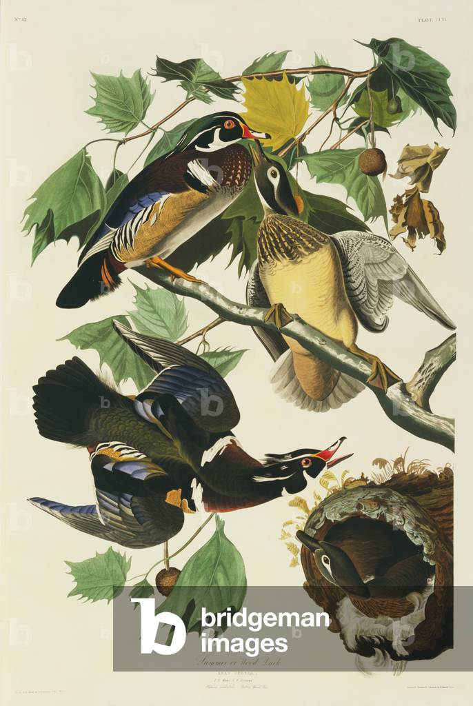 FLO4612916 American wood duck, Aix sponsa. Handcoloured copperplate drawn and engraved by Edward Donovan from his own ""Natural History of British Birds,"" London, 1794-1819. Edward Donovan (1768-1837) was an Anglo-Irish amateur zoologist, writer, artist and engraver. He wrote and illustrated a series of volumes on birds, fish, shells and insects, opened his own museum of natural history in London, but later he fell on hard times and died penniless.