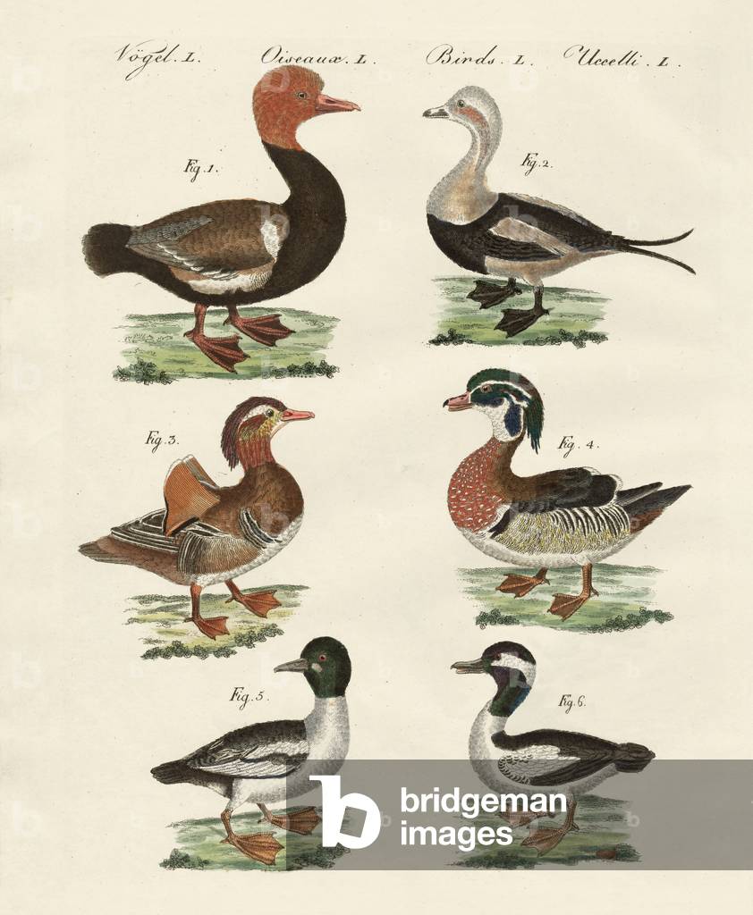 PRX997685 From ‘Bilderbuch für Kinder’ (Picture Book for Children) 1790-1830, published by Friedrich Justin Bertuch (1747-1822) Enten verschiedener ArtDie Kolbenente, die Winterente, die chinesische Ente oder Mandarinente, die Sommerente oder Brautente, die Quakente oder Schellente, die dickköpfige Ente, Enten, VögelAnas rufina, Anas glacialis, Anas galericulata, Anas sponsa, Anas clangula, Anas bucephala