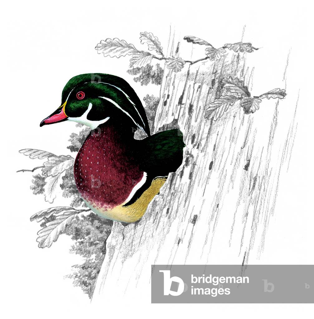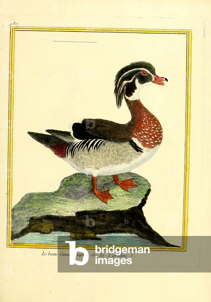 PRX11861010 The Wood Duck from Carolina impresses with its strikingly patterned plumage featuring a chestnut-brown breast, white belly, black back, and characteristic head pattern with crest. This North American duck species inhabits woodland waters and swamps in the Carolina region and other parts of eastern North America. It is known for its nesting habits in tree cavities and feeds on a mixture of plant material and aquatic insects. By martinet. From Histoire Naturelle des Oiseaux. Planches enluminées d'histoire naturelle, drawn and engraved by F.N. Martinet under the supervision of E.L. Daubenton, Paris 1770 - 1786. [Wood Duck, Carolina Duck, Aix sponsa, Anatidae, waterfowl, North America, Carolina, 18th century, natural history, Enlightenment, woodland waters, swimming bird, waterbird, crest]
