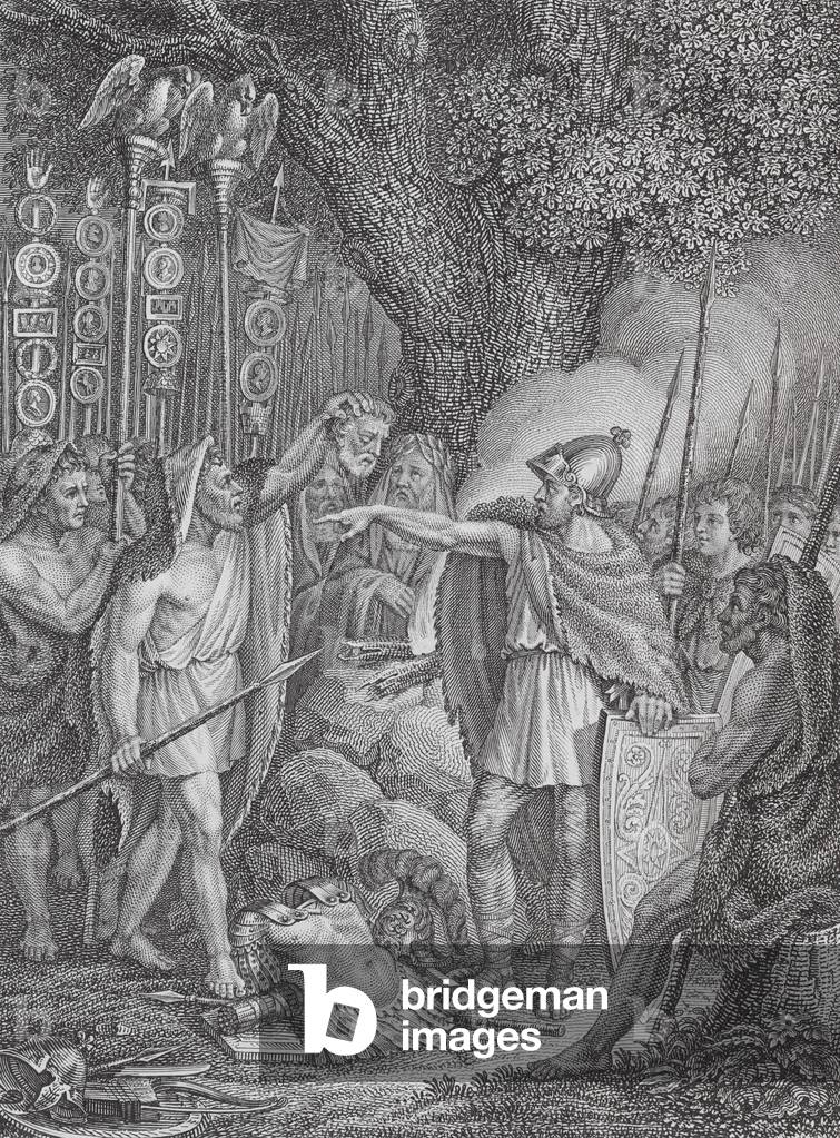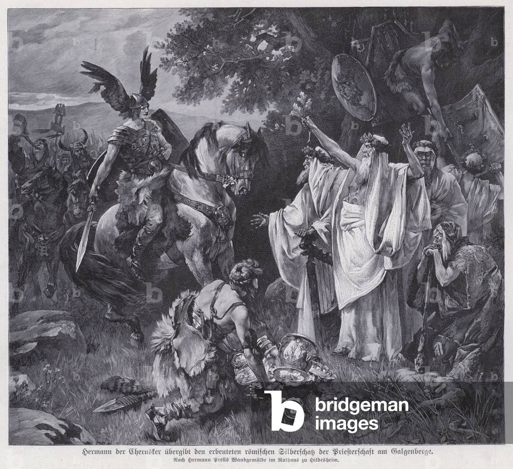 LLM7147832 Arminius, chieftain of the Cherusci, delivering the Roman silver treasure captured at the Battle of the Teutoburg Forest to the priesthood on the Galgenberge. Illustration for Bildersaal Deutscher Geschichte (Union Deutsche Verlagsgesellschaft, 1890).