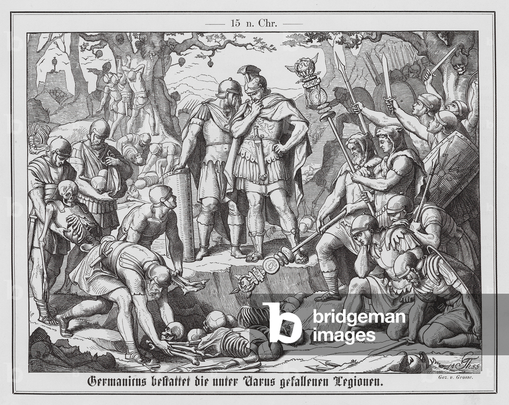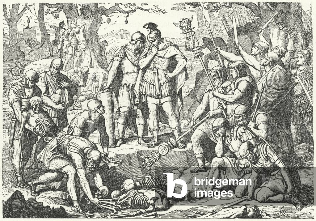 LLM11757457 Germanicus burying the bodies of Roman soldiers of the three legions of Publius Quinctilius Varus destroyed at the Battle of the Teutoburg Forest six years earlier, 15. Illustration from Deutsche Geschichte in Bildern, Volume 1 (C C Meinhold und Sohne, Dresden, 1862).By Theodor Grosse (1829-1891) (after)
