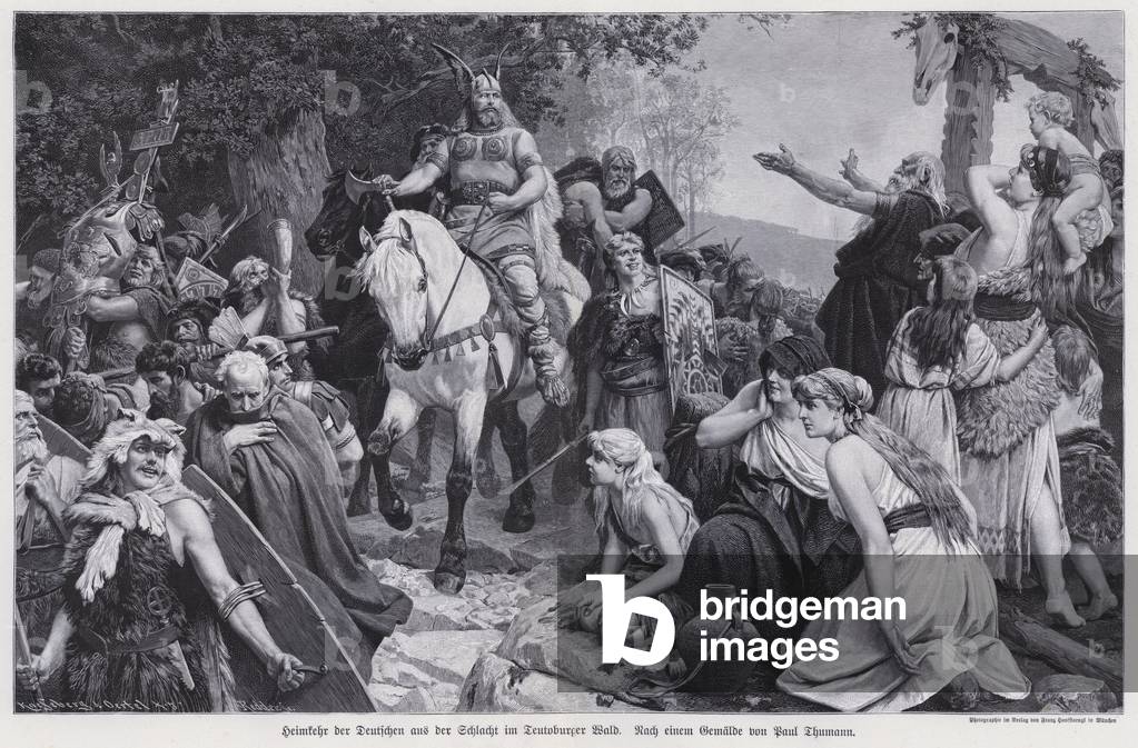 LLM7147834 Germanic warriors on their journey home after defeating the Romans at the Battle of the Teutoburg Forest, 9. Illustration for Bildersaal Deutscher Geschichte (Union Deutsche Verlagsgesellschaft, 1890).