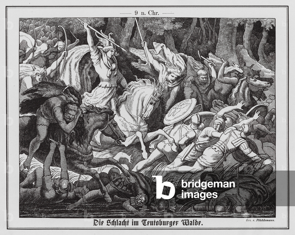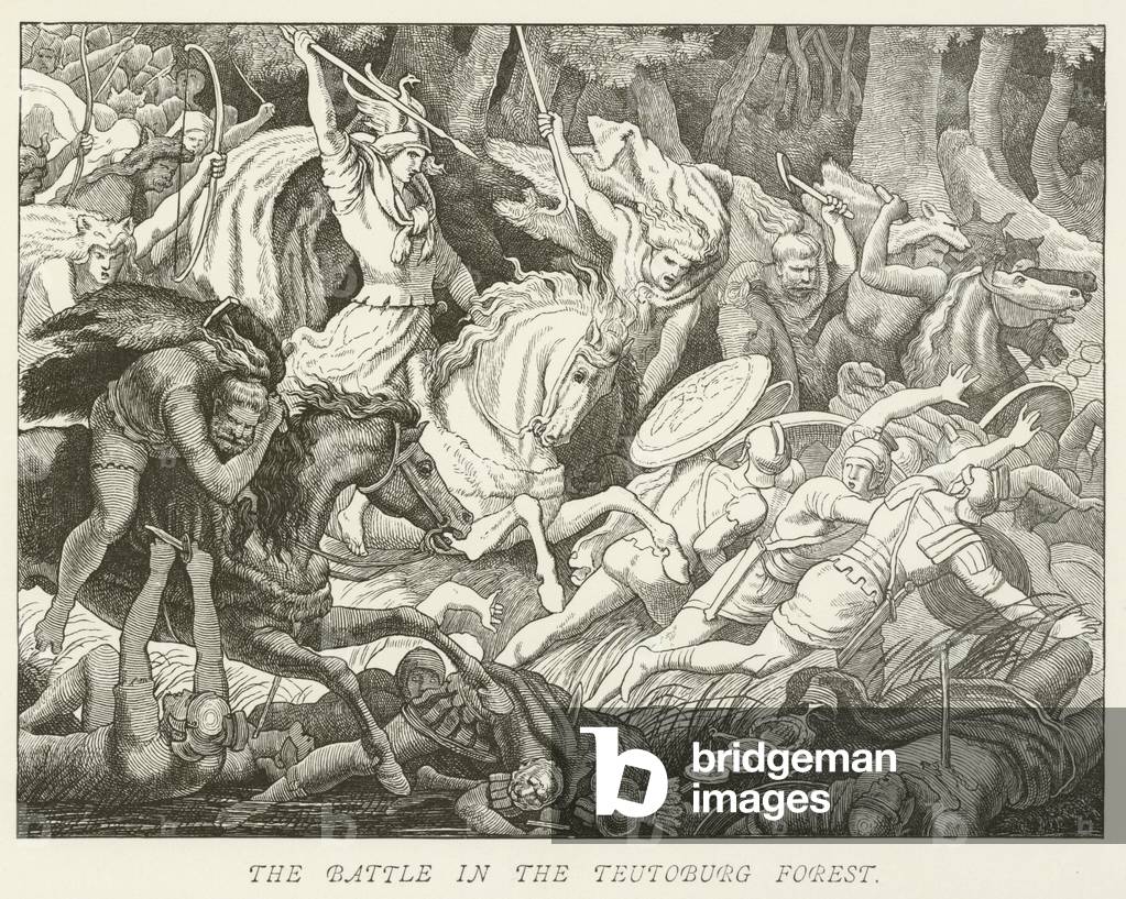 LLM11730658 Defeat of the Romans by Arminius at the Battle of the Teutoburg Forest, 9. Illustration from Deutsche Geschichte in Bildern, Volume 1 (C C Meinhold und Sohne, Dresden, 1862).By Hermann Pluddemann (1809-1868) (after)