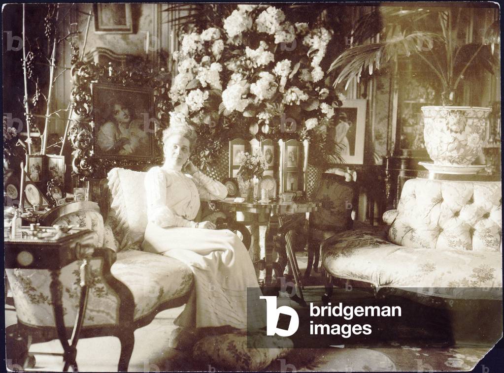 FIA4227285 Princess Zinaida Yusupova (Zenaide Nikolaeevna Youssoupoff, Ioussoupova, 1861-1939) in the Family Living Room of the Yusupov Palace in St. Petersburg, Anonymous. Silver Gelatin Photography, 1900s, State Museum Arkhangelskoye Estate, Moscow