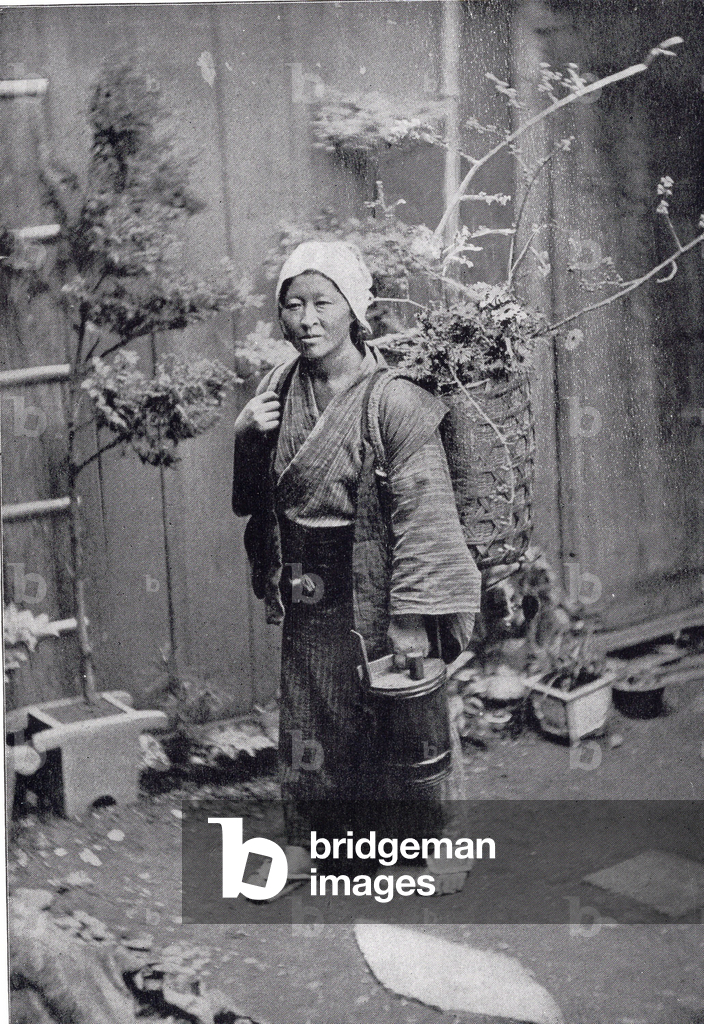 LSE4328287 A traveling salesman of painted lantern passes by a florist shop in Yedo (or Edo, present-day Tokyo), where a woman creates a composition of large flowers, while bonsai size is rather a masculine art. Engraving to illustrate Japan, travel story by Aime Humbert, minister of the Swiss Confederation, in 1863-1864, published in “Le tour du monde, nouveau journal des voyages”, under the direction of Edouard Charton, 1868, Paris. Selva Collection.