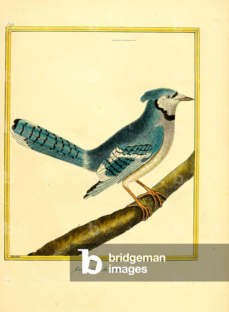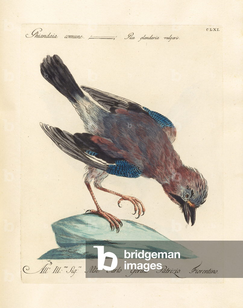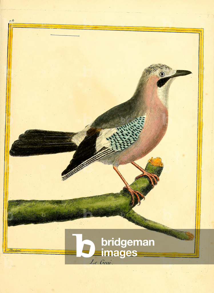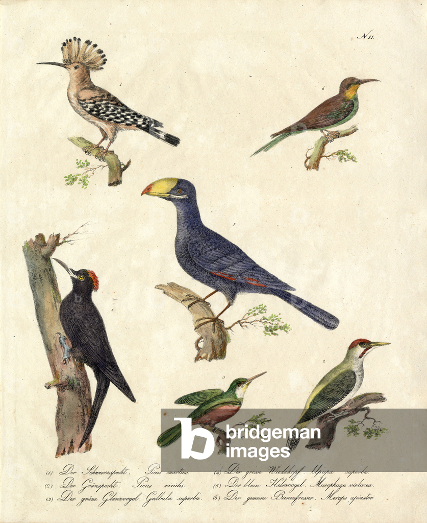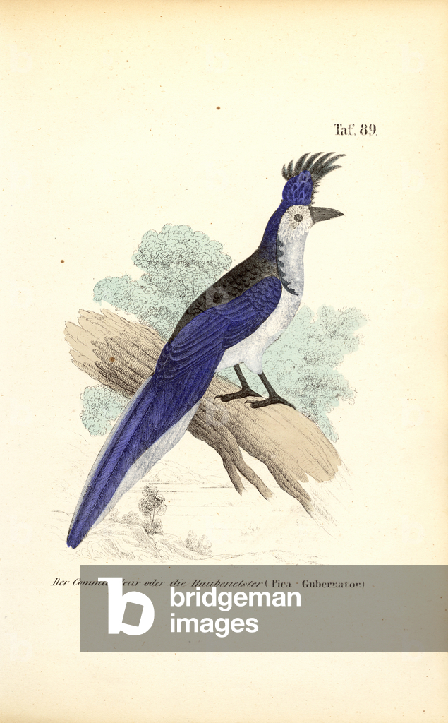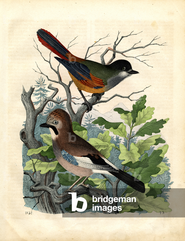 The Eurasian Jay (Garrulus glandarius) with its pinkish-brown plumage, blue wing patches, and black beak perches on a branch amidst oak leaves. Above it sits the Common Redstart (Phoenicurus phoenicurus) with its characteristic rusty-red tail, greenish back, and gray head. Both bird species are widespread in European forests and gardens, with the jay being an omnivore that particularly collects and disperses acorns, while the redstart is known as an insectivore and migratory bird.. From Das Buch der Welt, ein Inbegriff des Wissenswürdigsten und Unterhaltendsten aus den Gebieten der Naturgeschichte, Naturlehre, Länder- und Völkerkunde, Weltgeschichte, Götterlehre etc. Mit vielen colorirten und schwarzen Abbildungen. Published by Julius Hoffmann, Hoffmannsche Verlags-Buchhandlung, Stuttgart, 1842 - 1868.. [Eurasian Jay, Garrulus glandarius, Common Redstart, Phoenicurus phoenicurus, corvids, Corvidae, flycatchers, Muscicapidae, woodland birds, European bird species, oak forest, migratory bird, resident bird, ornithology, natural history, zoology, hand-coloured copperplate engraving]