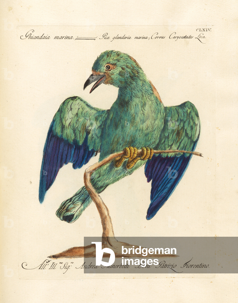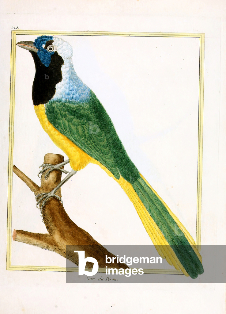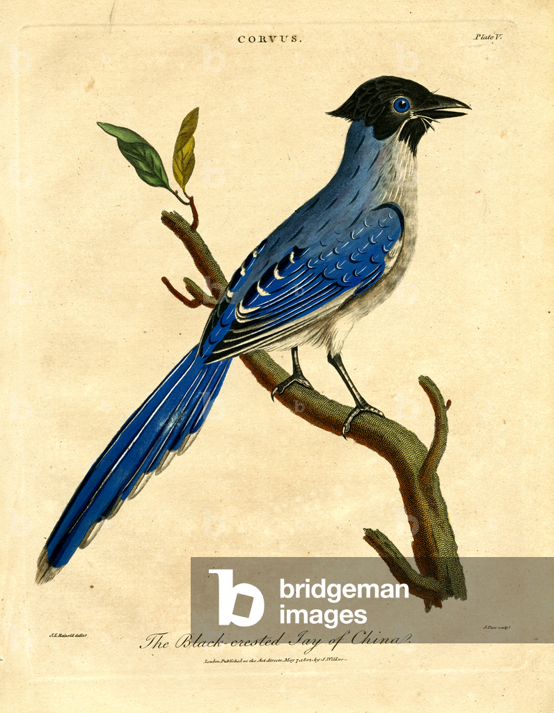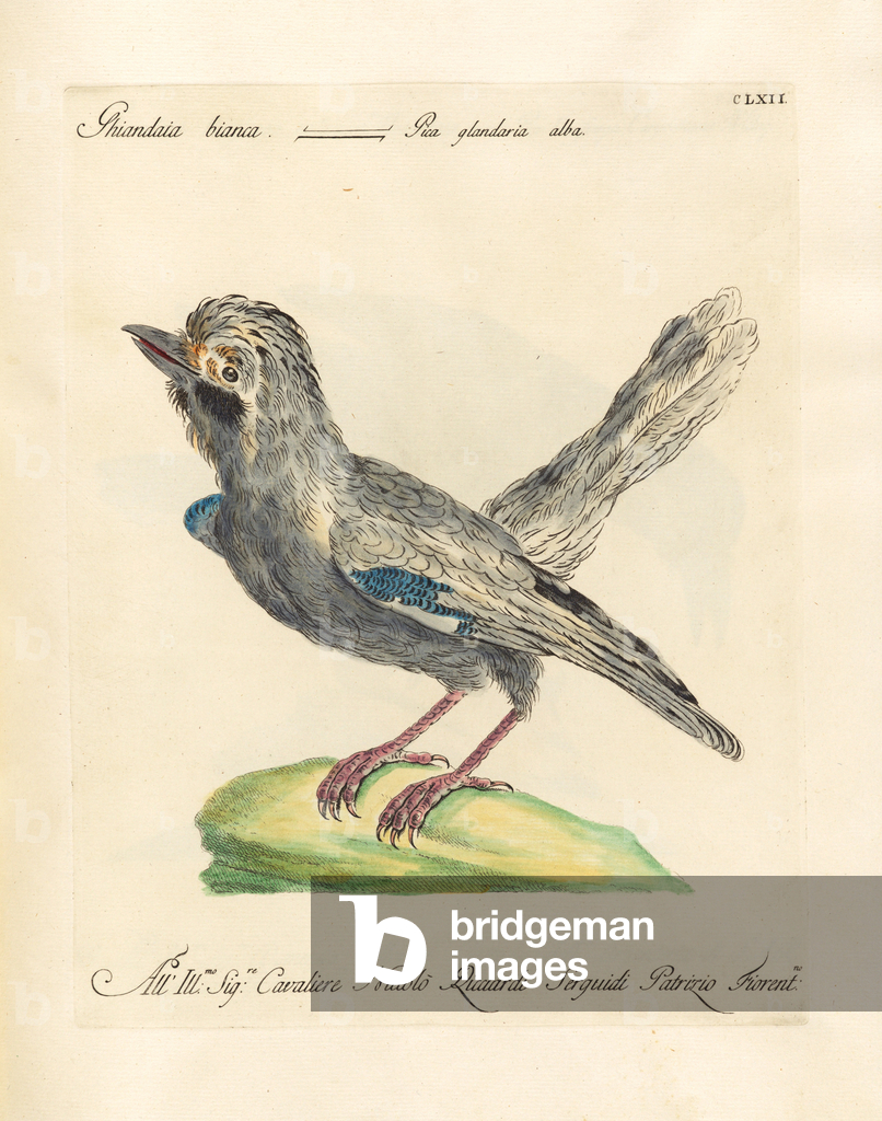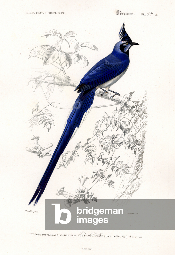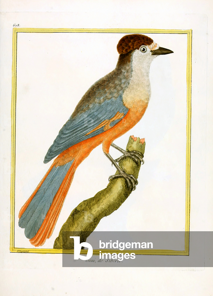 The Eurasian Jay (Garrulus glandarius) with its pinkish-brown plumage, blue wing patches, and black beak perches on a branch amidst oak leaves. Above it sits the Common Redstart (Phoenicurus phoenicurus) with its characteristic rusty-red tail, greenish back, and gray head. Both bird species are widespread in European forests and gardens, with the jay being an omnivore that particularly collects and disperses acorns, while the redstart is known as an insectivore and migratory bird.. From Das Buch der Welt, ein Inbegriff des Wissenswürdigsten und Unterhaltendsten aus den Gebieten der Naturgeschichte, Naturlehre, Länder- und Völkerkunde, Weltgeschichte, Götterlehre etc. Mit vielen colorirten und schwarzen Abbildungen. Published by Julius Hoffmann, Hoffmannsche Verlags-Buchhandlung, Stuttgart, 1842 - 1868.. [Eurasian Jay, Garrulus glandarius, Common Redstart, Phoenicurus phoenicurus, corvids, Corvidae, flycatchers, Muscicapidae, woodland birds, European bird species, oak forest, migratory bird, resident bird, ornithology, natural history, zoology, hand-coloured copperplate engraving]