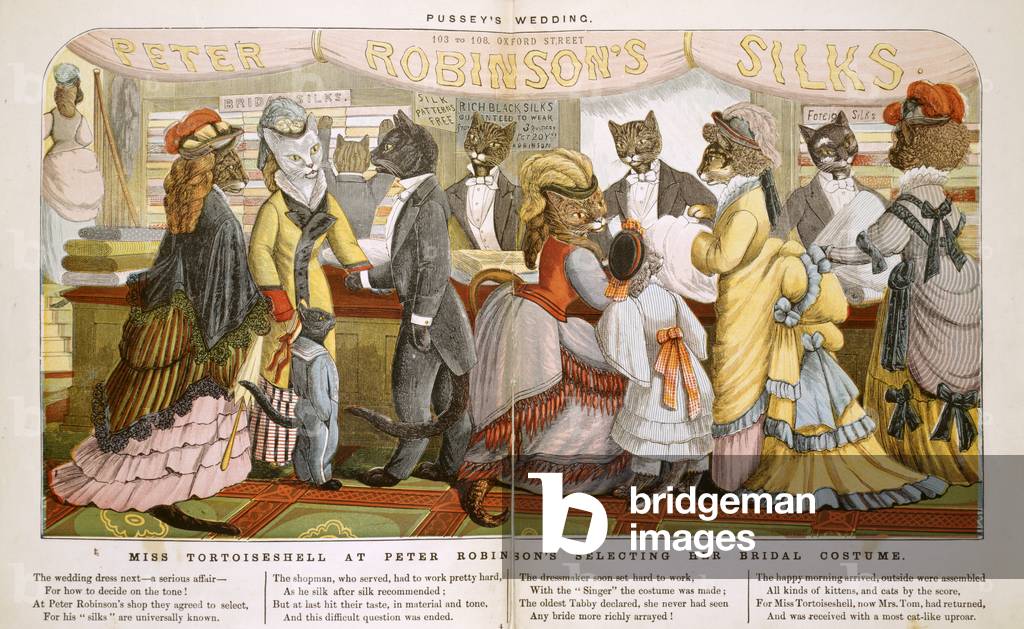 BL3265937 Pussey's Wedding. [In verse. With illustrations.]Author: Pussey / Read, Brooks & Co.: London, [1876?]Language: EnglishSource/Shelfmark: 12837.p.52, 4Miss Tortoiseshell at Peter Robinson's selecting her bridal costume'.Image taken from Pussey's Wedding. [In verse. With illustrations.] Originally published/produced in Read, Brooks & Co.: London, [1876?].