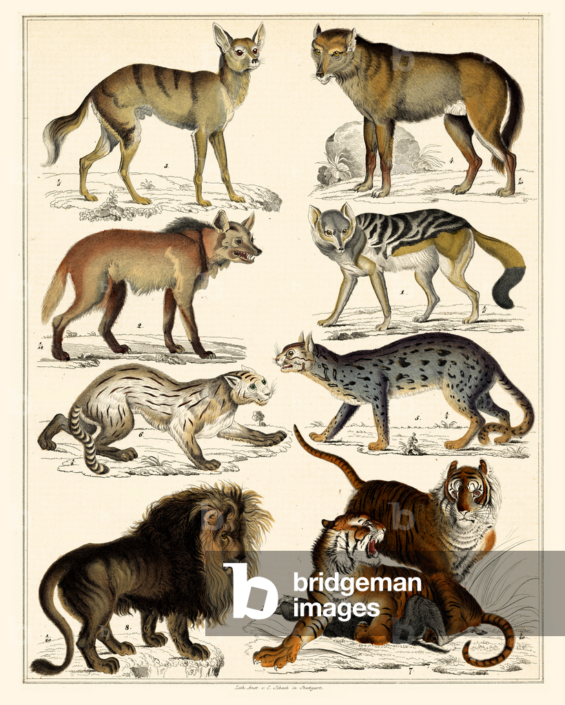 PRX11861550 The plate presents various species of wild cats and big cats in their characteristic poses. The illustrations show the different fur patterns and body proportions of these predators and highlight physiognomic details such as teeth, claws, and facial features that were important for taxonomic classification. By C. Schach. From Abbildungen zu Okens allgemeiner Naturgeschichte für alle Stände. Stuttgart, Hoffmannsche Verlagsbuchhandlung, 1843. [Predators, Felidae, big cats, tiger, lion, lynx, serval, wolf, jackal, Carnivora, mammals, leopard, zoology, 19th century, natural history]