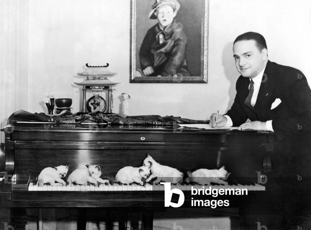 UIG3519498 New York, New York: 1927. Pianist, composer, and band leader extraordinaire, Vincent Lopez writes on his piano while five kittens play the keyboard.