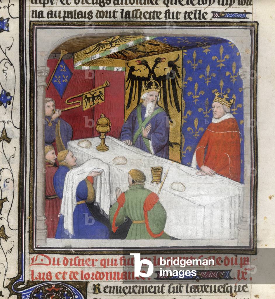 BL3276275 Grandes Chroniques de FranceCirca 1415Language: FrenchSource/Shelfmark: Cotton Nero E. II pt 2, f.229[Miniature] Banquet of the Emperor Charles IV of Germany and King Charles V of FranceImage taken from Grandes Chroniques de France.Originally published/produced in Circa 1415.