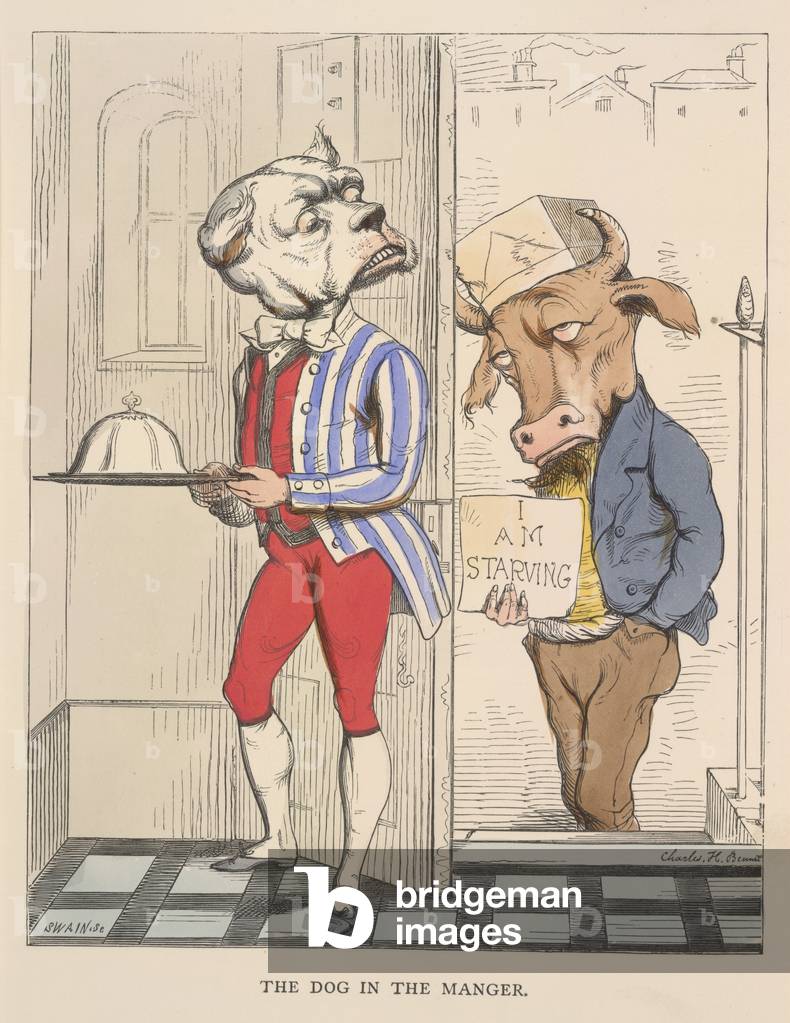 BL3275349 The Fables of Aesop and others. Translated into humAuthor: Aesop / Illustrator: Bennett, C.H; Swain, JW. Kent & Co.: London, 1857Language: EnglishSource/Shelfmark: 12305.g.11, opposite 17A dog dressed as a butler. A bull stands at a door holding a sign which states 'I am starving'.Image taken from The Fables of Aesop and others. Translated into human nature, designed and drawn on the wood by Charles H. Bennett, etc.Originally published/produced in W. Kent & Co.: London, 1857.