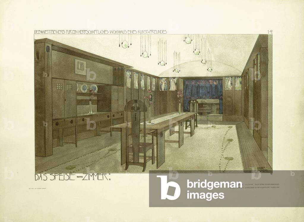 CH991165 Dining Room. An illustration from a group of three portofolios entitled 'Meister der Innenkunst', published by Alex Koch (1902). Emil Hochdanz (1816-1885) after Charles Rennie Mackintosh (1868-1928). Colour lithograph. Designed circa 1901. 40.5 x 53.3cm. The designs were submitted to 1901 competition to design the House for a Lover of Art.