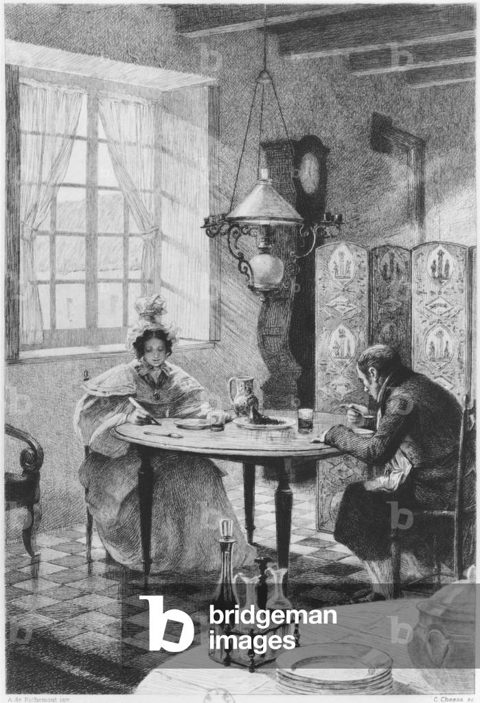 XLA3760638 Hard Times-novel by Charles Dickens. Illustration by Fred Walker (1840-1875) to scene 'Mr Harthouse dining at the Bounderbys' '. First Published in 1854. This edition Published by Hazell, Watson & Viney, Ltd, London.
