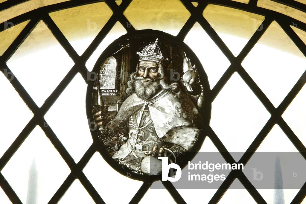 HRP2624402 The White Tower. The Chapel of St John the Evangelist. Detail of a stained-glass window. The stained glass was once part of the collection of Sir Horace Walpole and most of it was originally from Walpole's Round Drawing Room at Strawberry Hill. It came to the Tower after it was bought in the great auction of his collection in 1842 and was installed in the chapel in the late 19th century