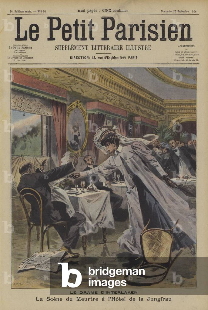 LLM3097631 Murder in the Hotel Jungfrau in Interlaken, Switzerland. The shooting of wealthy Parisian Charles Muller by the young Russian wife of an Englishman named Mrs Stafford. The killer claimed that she thought Muller was Russian Interior Minister Pyotr Durnovo. Le Drame D'Interlaken, La Scene du Meurtre a l'Hotel de la Jungfrau. Illustration for Le Petit Parisien, 23 September 1906.