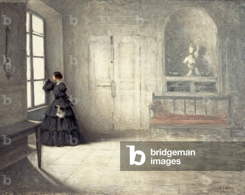 XOS8984330 George Sand's dining room at Nohant (Nom d'usage)Lauth, Charles-FrédéricView of George Sand's dining room in Nohant. In a light-toned interior, a woman in a black dress looks out of the window, a book in her hand.Artist's signature - S.b. g.: "F. LAUTH / NohantOld inventory number - On reverse, stencilled in black paint: "DIRECTION / DES BEAUX-ARTS / DE LA VILLE DE PARIS 32 74".Number - On the reverse, in blue: "E.15.313 / P.1667".Handwritten inscription - On a label in black ink: "VOLNEY / Salle à manger / de Nohant".; Number - On two labels in black ink: "61" "E.15.313 / P.1667"Handwritten inscription - On the reverse, in white chalk: "CASIER / 12 B".Inventory number: D 98.1