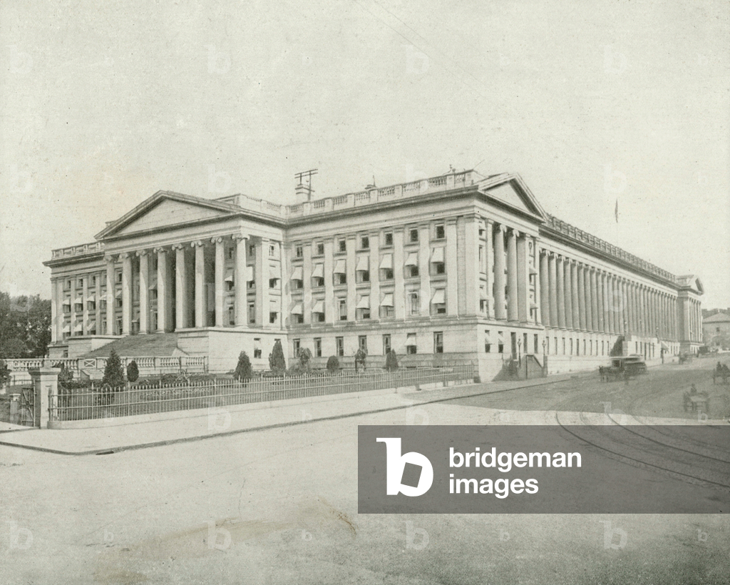 LLM11720758 Treasury Building, Washington, D. C. The Interesting and elegant building, the United States Treasury, one of the fine adornments of the National Capital, flanks the Executive Mansion on the east, having the Capitol as its vis-a-vis at the farther end of Pennsylvania Avenue. The immense pile is lonic in its architecture, with a colonnade on the east front, and porticos on the other three sides. It is 500 feet long and 280 feet wide. It was modelled after the Temple of Minerva at Athens, and cost six million dollars. The chief sight of the Treasury Building is the great Cash Room, lined throughout with rich marbles. Other departments of interest are the Note Redemption Room, and especially the Silver Vaults, containing coin and bullion to the value of hundreds of millions of dollars. Other interesting exhibits, which do not excite the cupidity of the visitor, are the portraits of the more prominent Secretaries of the Treasury, and an exhibit a tolerably large one-of counterfeit money. Illustration for Our Kin Across the Sea (Greig, 1898).By American Photographer (19th Century)