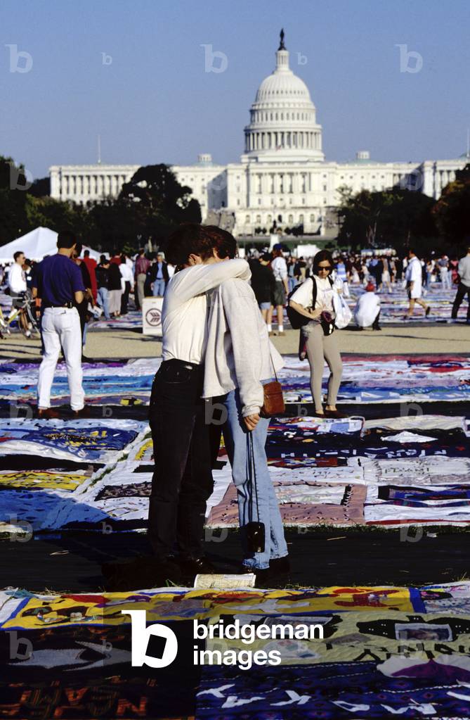 SAO3852648 The people hugging at The NAMES Project AIDS Memorial Quilt, known as AIDS Memorial Quilt, shown on the National Mall in Washington, DC during October 1996. It is an enormous quilt made as a memorial to the lives of people who have died of AIDS-related causes. Weighing an estimated 54 tons, it is the largest piece of community folk art in the world as of 2010.