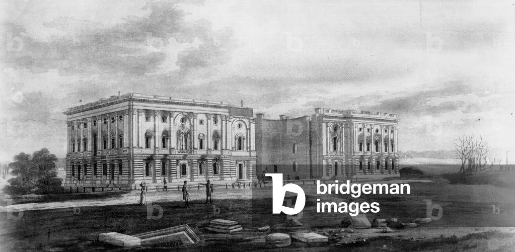 UIG1574863 A view of the Capitol after the conflagration of the 24th August 1814. A view from the southeast of the fire-damaged U.S. Capitol building, a result of the War of 1812. On August 24, 1814, British general Robert Ross led his troops into Washington with strict orders to burn only public buildings. On August 25, a tornado blew through the city, bringing torrential rains that quelled both the fires and the British desire to pursue further action in Washington.