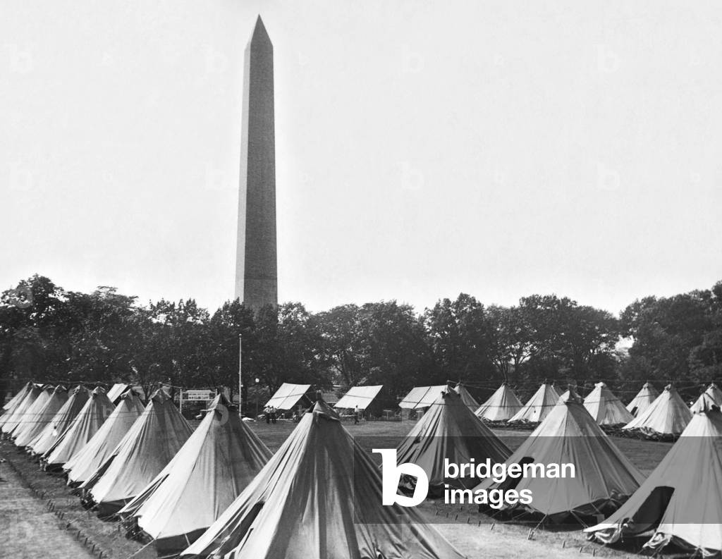 UIG3272104 Washington, D.C.: June 13, 1929 4-H club members' tents on the lawns of the U.S. Dept. of Agriculture during their annual visit to the nation's Capitol, with the Wshington monument in the distance.