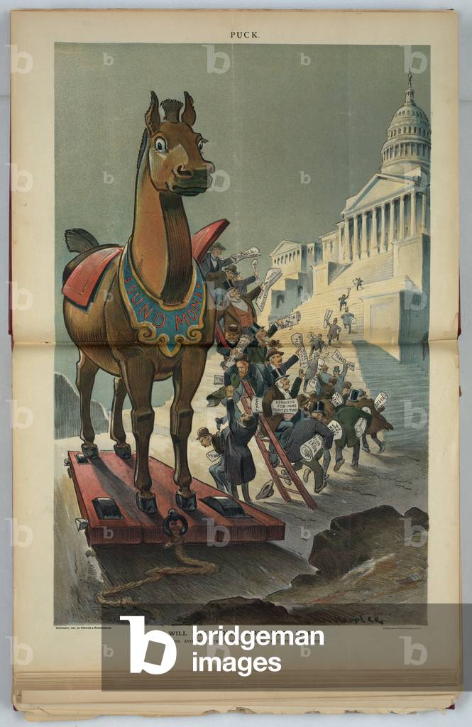 XOS7130756 A Trojan Horse labeled "Sound Money" with businessmen carrying papers labeled with demands for more protection. Attempting to take Congress by climbing up the steps of the U.S Capitol.