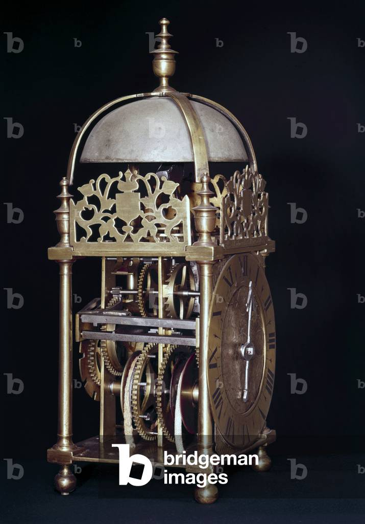 Clocks, Domestic, General Lantern clock, c 1650. Lantern timepiece by Thomas Knifton at the Cross Keys, Lothbury, London. The English lantern clock of the 17th century was the immediate successor of the German type of Gothic iron clock; of the same general layout but made mainly of brass rather than iron. The lantern clocks of the first half of the century had their timekeeping controlled by a balance wheel, but this was replaced by a pendulum in the latter half of the century. This clock is an example of the earlier type, controlled by a verge escapement with a wheel balance. With a balance of this type the only way to regulate the clock is by altering the amount of driving weight: a heavier weight makes the clock go faster. Knifton was a freeman of the Clockmakers' Company of London from 1640 to 1662. View of face. ©SSPL/Science Museum