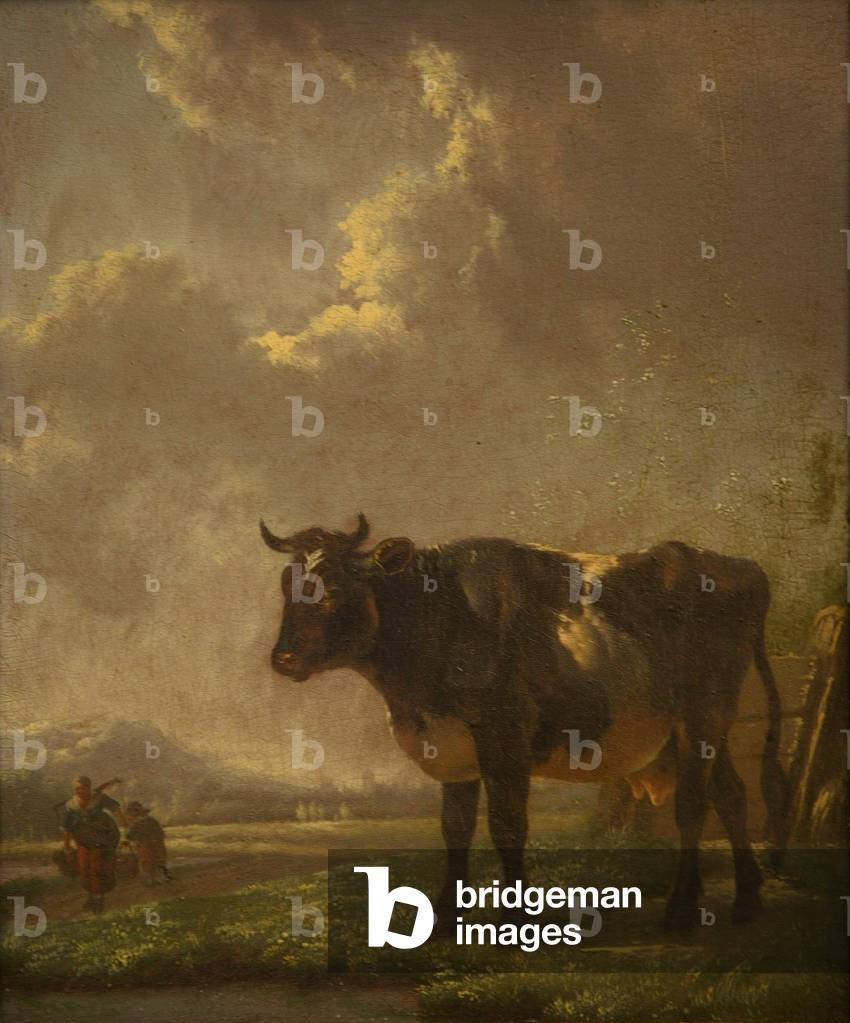 UIG3732494 Engraving depicting a Welsh milkmaid sitting, watching some of the cows in the field. Dated 19th Century.