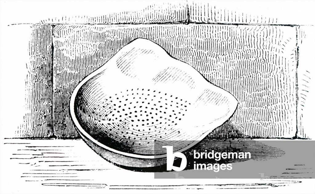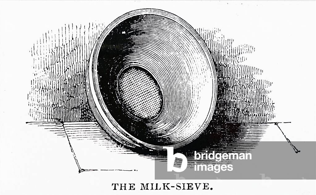 UIG3732522 Engraving depicting a milk sieve, which was usually made of plain wood with a wired gauze bottom. Dated 19th Century.