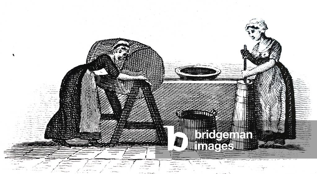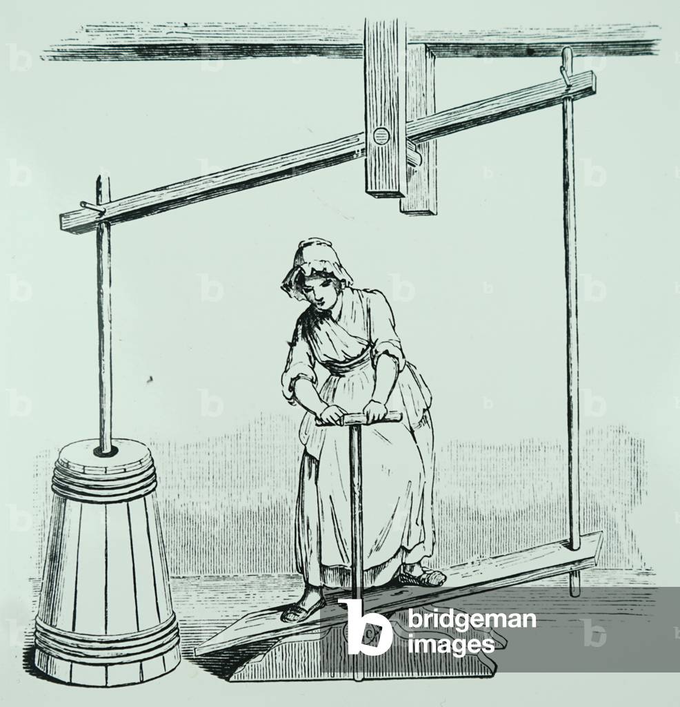 UIG3732535 Engraving depicting the use of a see-saw type of vertical butter churn. Dated 19th Century.