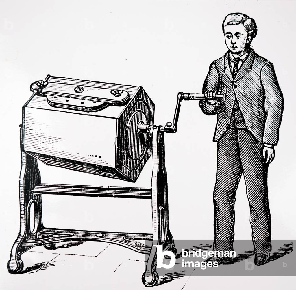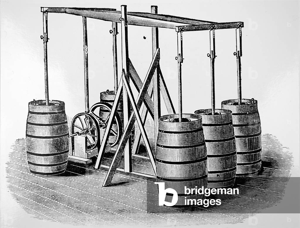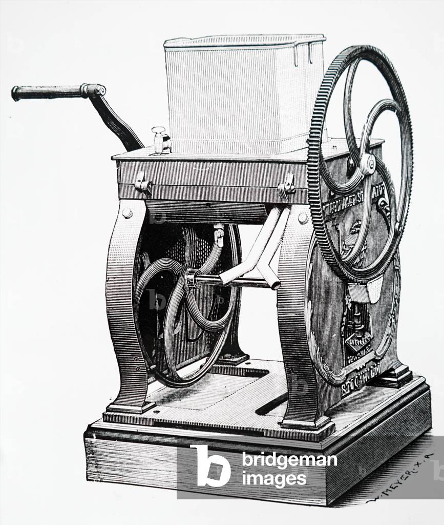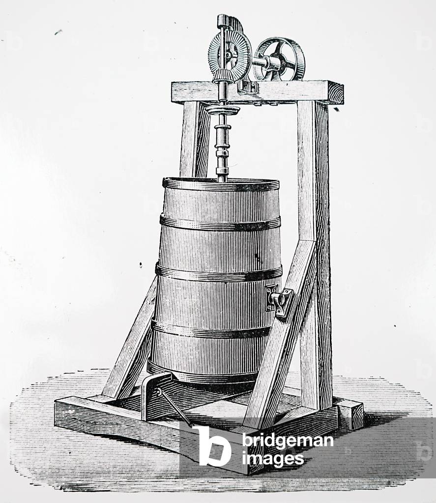 UIG3732824 Engraving depicting Hauducoeur's hand-powered machine used for mixing and blending butter. Dated 19th Century.