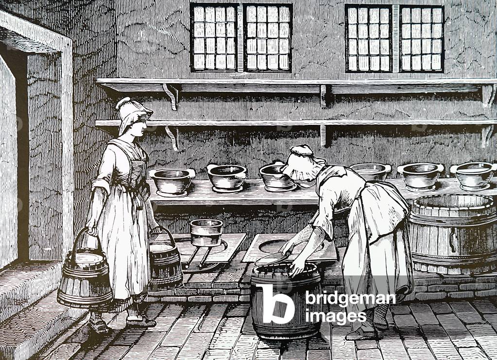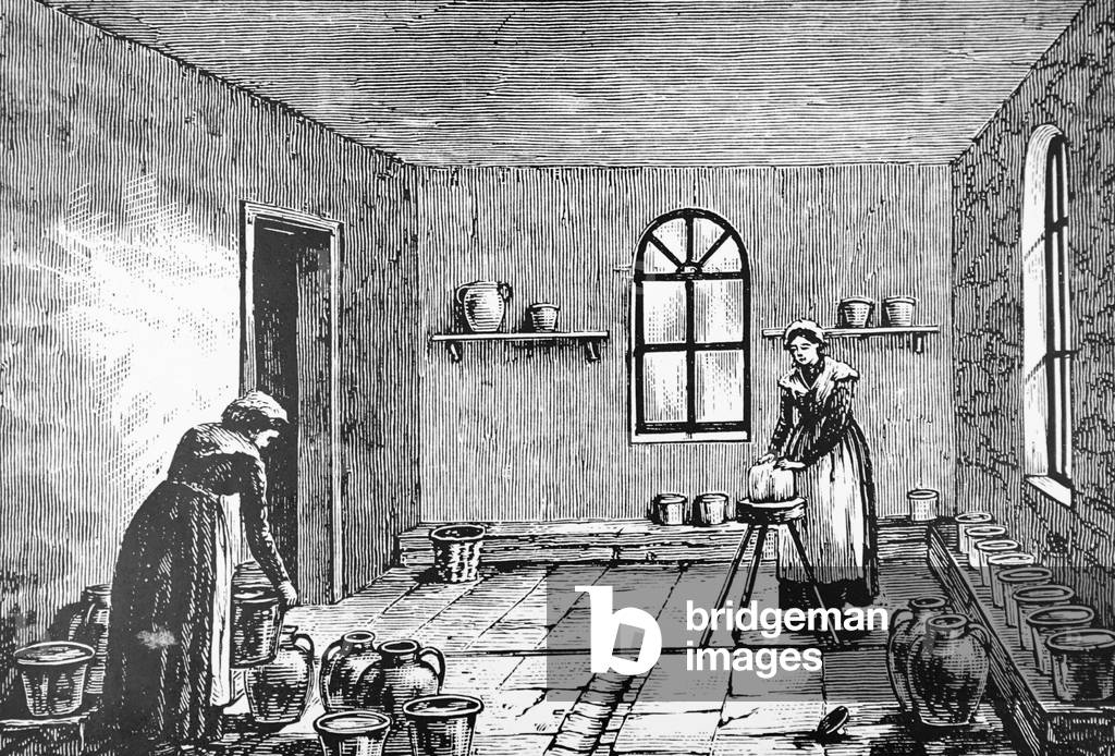 UIG3732547 Engraving depicting the making of Brie at the Maison-du-Val dairy in France. The process involves filling forms with curd, which are then placed on straw mats on racks where they are turned and salted during the course of two days. Dated 19th Century.