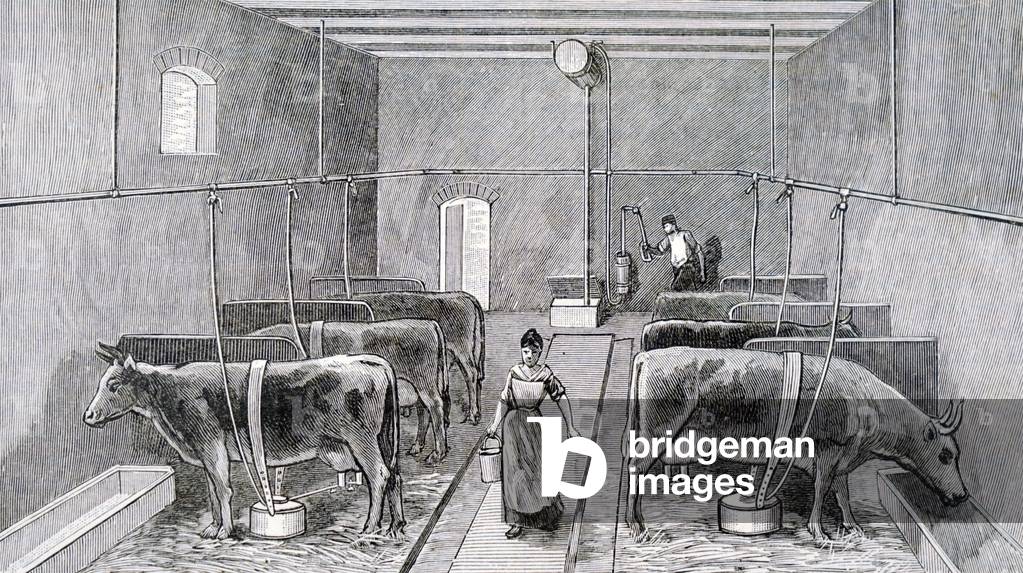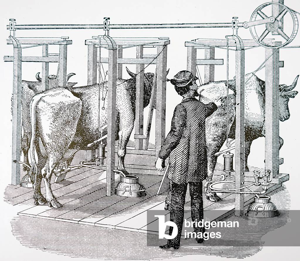 UIG3732501 Engraving depicting new technology used for milking multiple cows. Dated 19th Century.