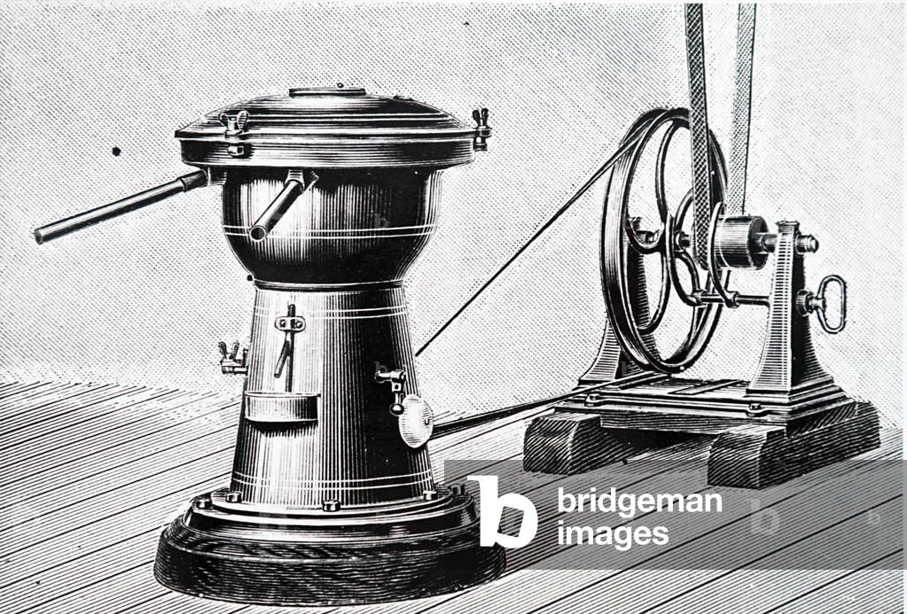 UIG3732612 Engraving depicting Gustaf de Laval's centrifugal cream separator. Gustaf de Laval (1845-1913) a Swedish engineer and inventor. Dated 19th Century.