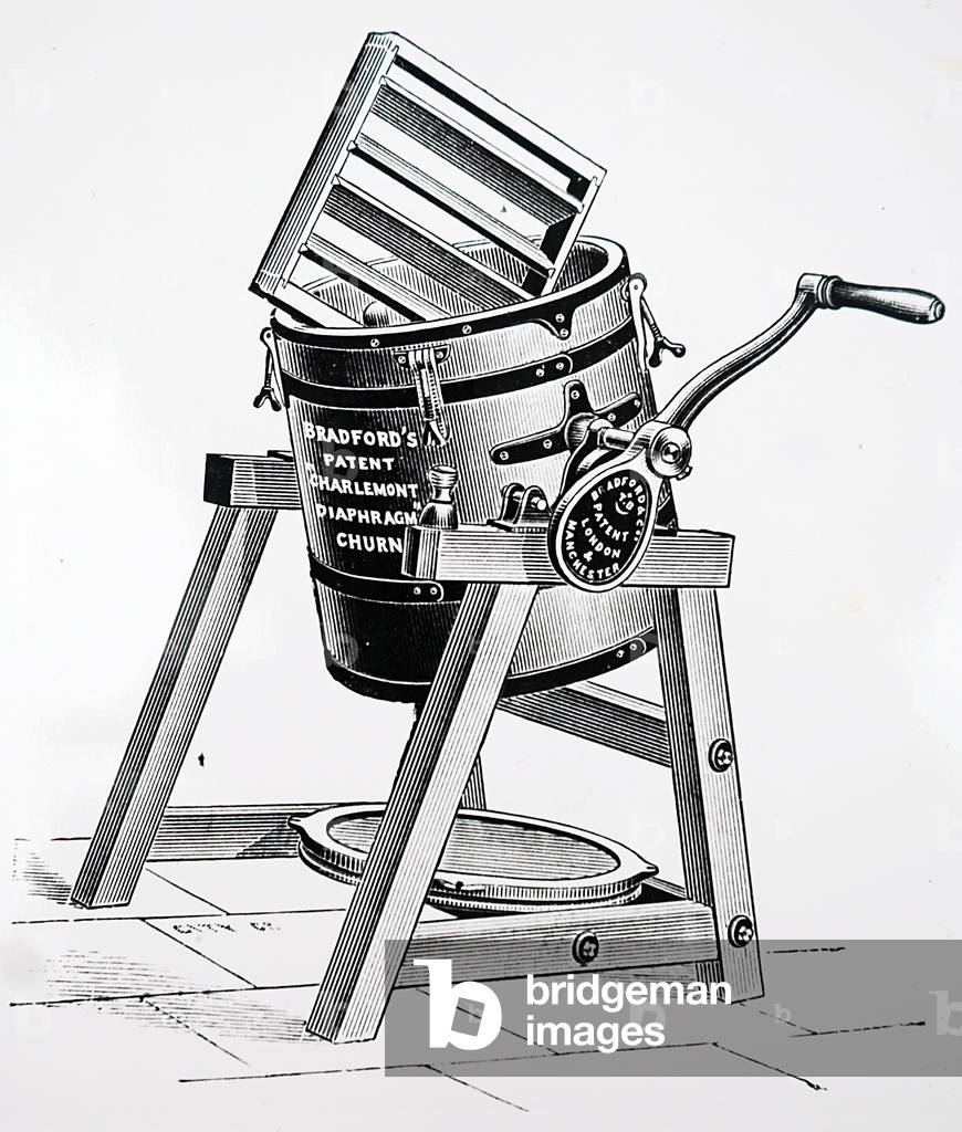 UIG3732532 Engraving depicting Bradford's 'Diaphragm' churn: the large lid (on stand at bottom) made removal of butter easy, and also facilitated cleaning as did the fact that the beaters could be removed. Dated 19th Century.